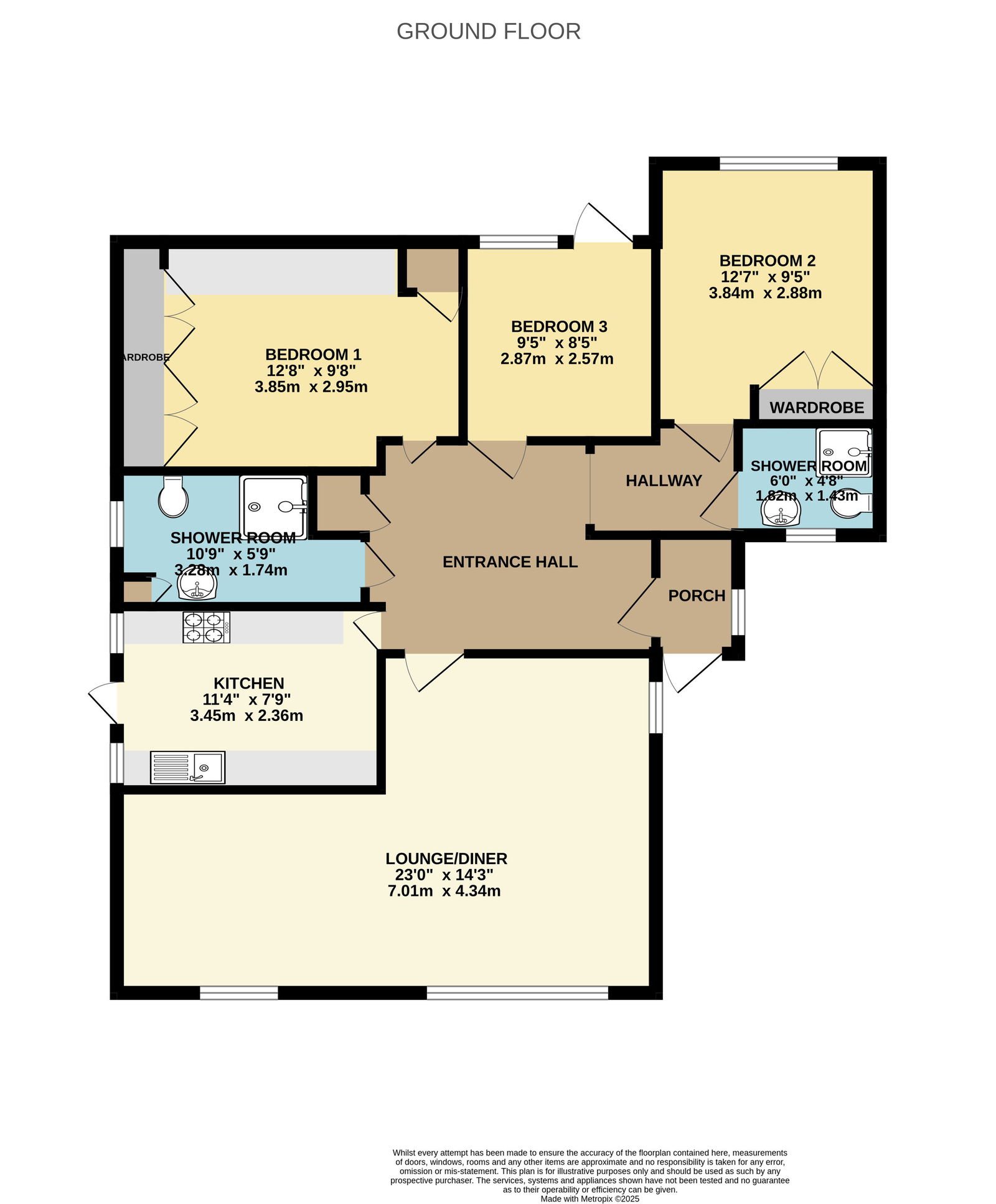 The family shower room is fitted with a matching three-piece suite comprising a low-level WC, pedestal wash hand basin, and an oversized shower cubicle with a direct-feed shower unit, built-in storage, and tiled splashbacks. There is also a second shower room fitted with a three-piece suite comprising a shower unit with electric shower, low-level WC, pedestal wash hand basin, and a window to the front elevation.