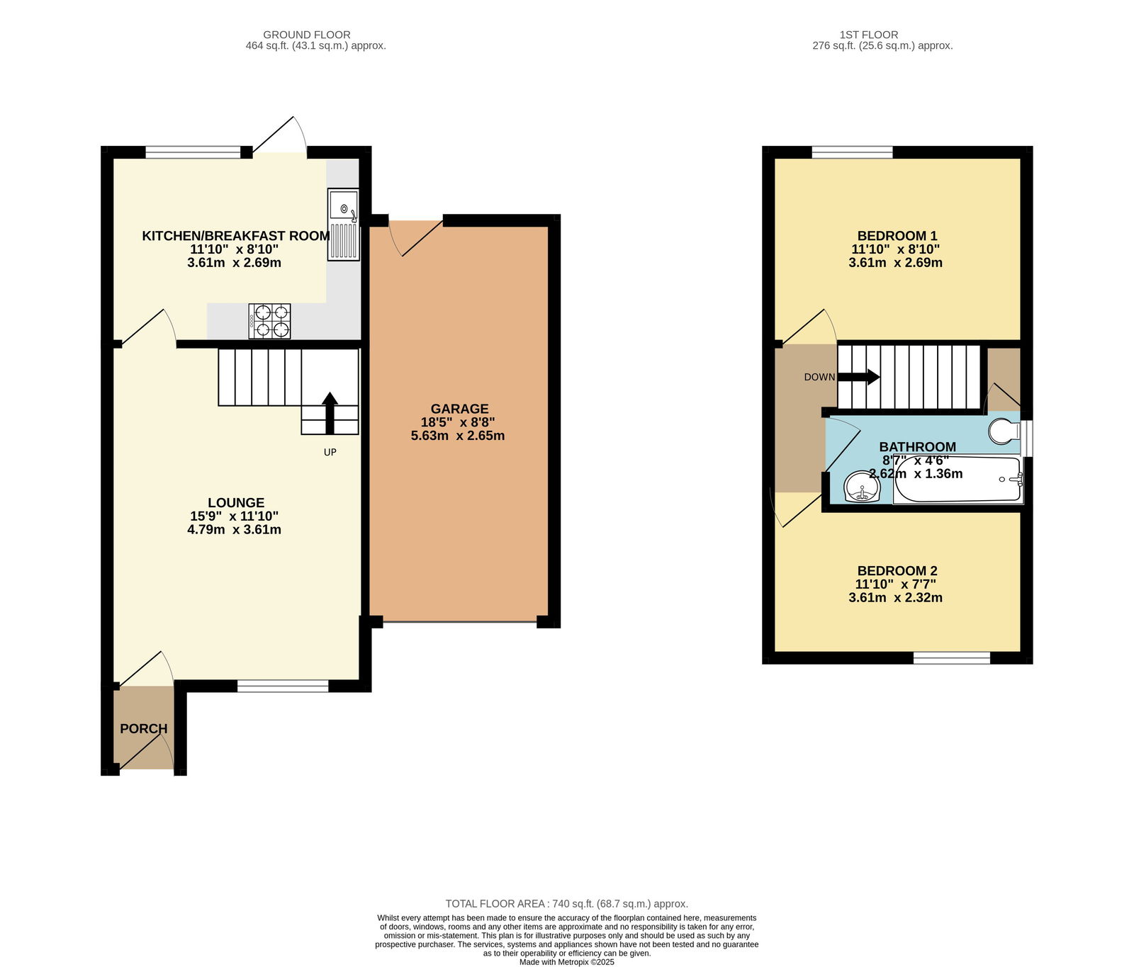 Externally, there are front and rear gardens, a single garage, and a driveway for two cars.