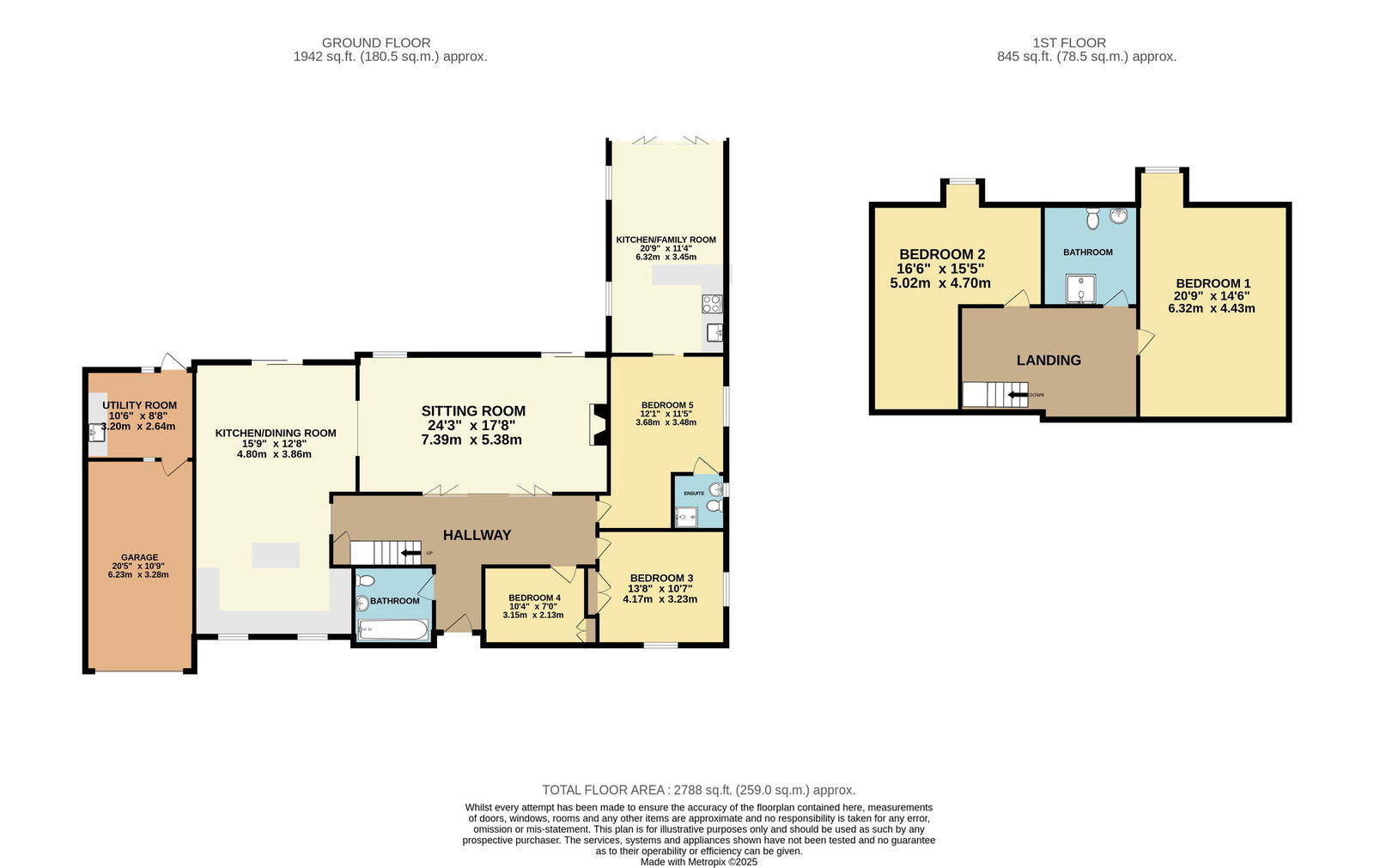 Bedroom three is a spacious double aspect room with windows to the front and side elevation and a fitted storage cupboard. Bedroom four is another double aspect room with windows to the side and front elevation and fitted storage cupboard. Bedroom five is another double, with a window to the side elevation and an en-suite wet room, which includes a direct-feed shower unit, tiled splashbacks, a low-level WC, and a pedestal wash hand basin.